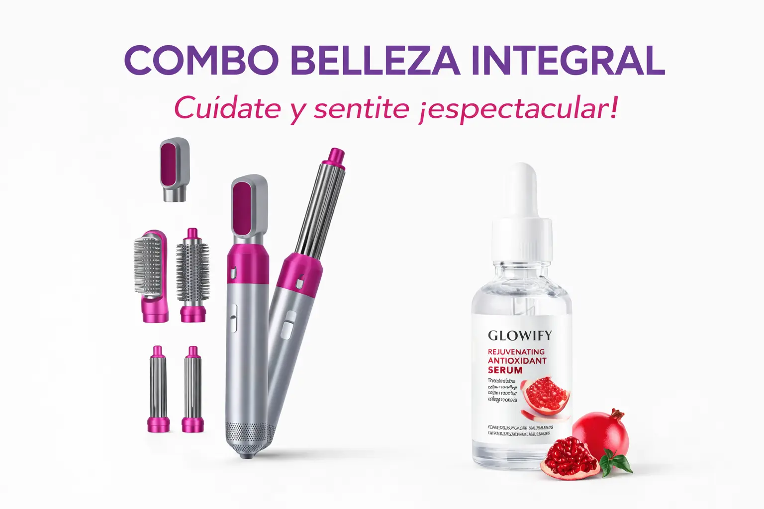 🌸 COMBO BELLEZA INTEGRAL 🌸 Incluye: ✔️ Cepillo Secador 5 en 1 – Alisá, ondulá, modelá y conseguí un acabado profesional desde casa. ✔️ Glowify Serum Rejuvenecedor Antioxidante – Ilumina, hidrata y rejuvenece tu piel para que luzca fresca y saludable. (Se despachan variedades según disponibilidad)